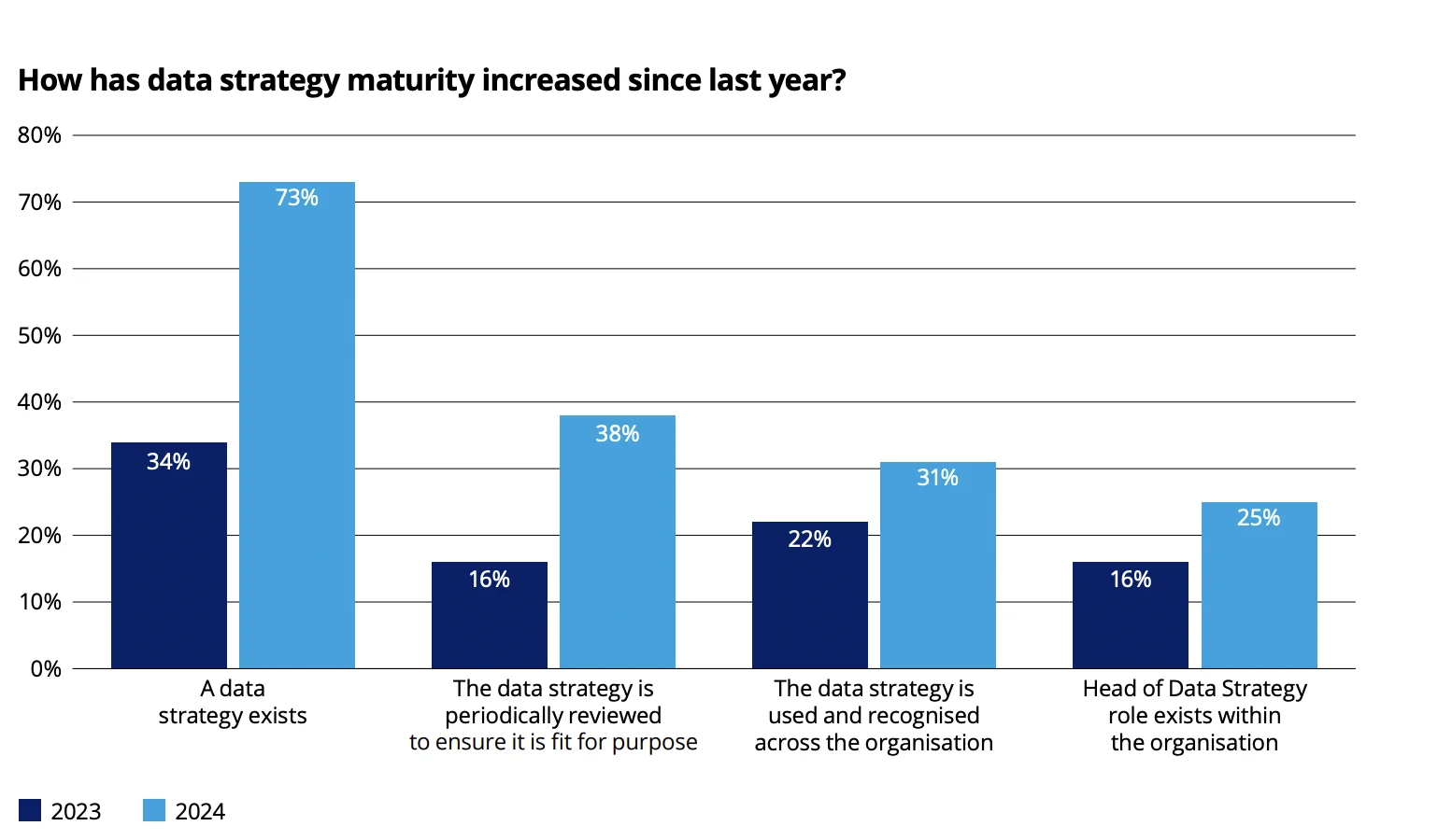 73% of CDOs have already had a data strategy in place since 2024, up from 63% in 2023. Source: Deloitte Chief Data Officer Survey, 2024