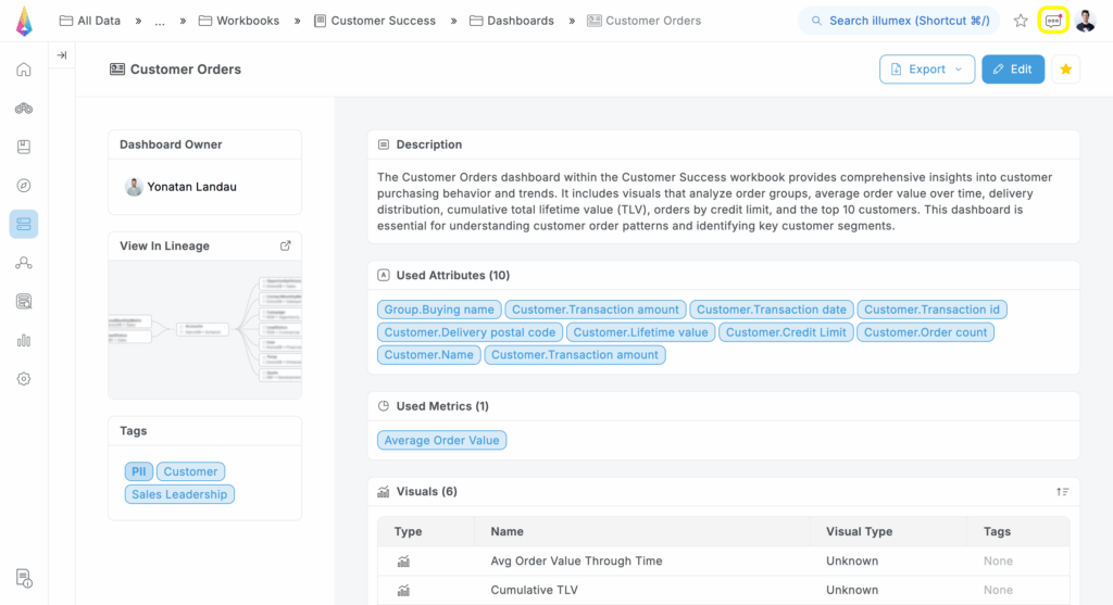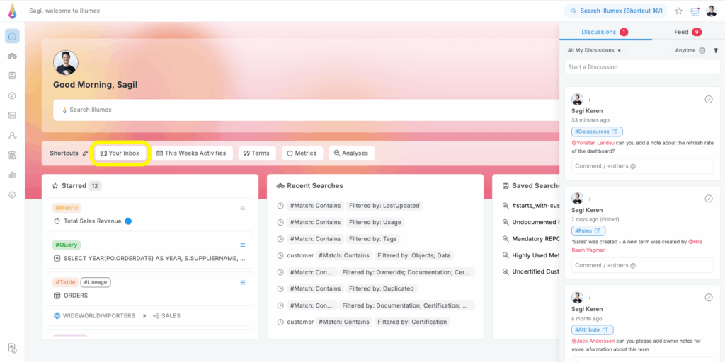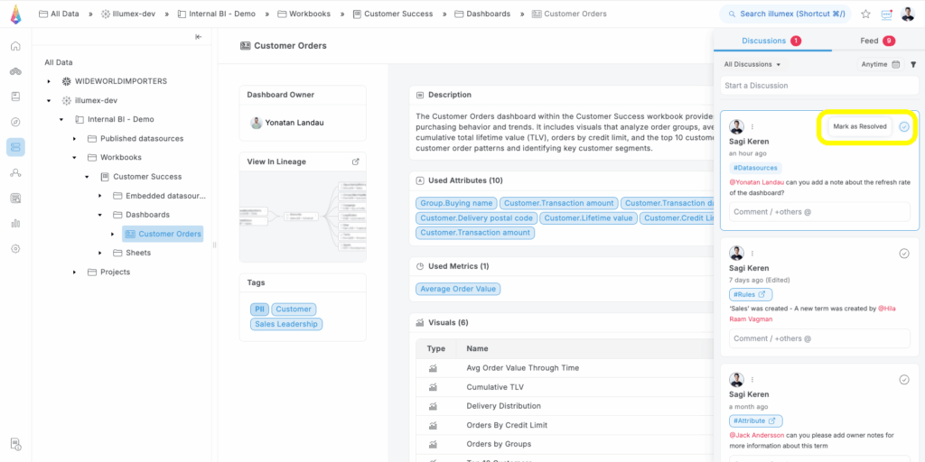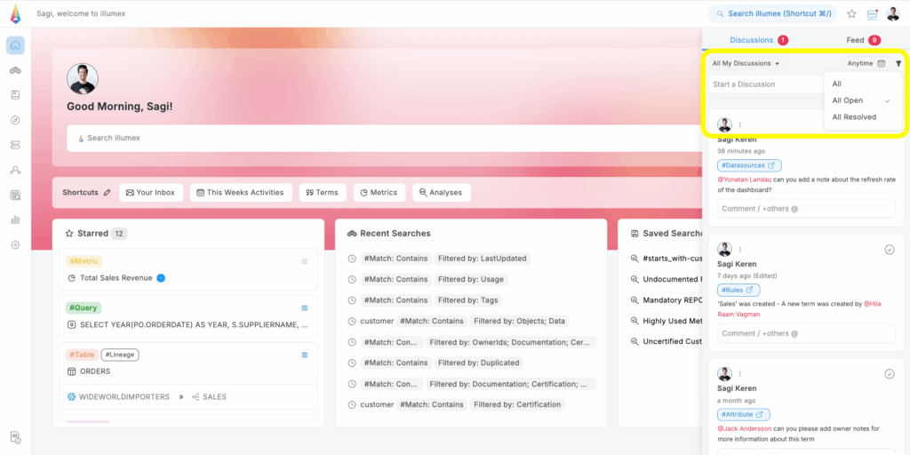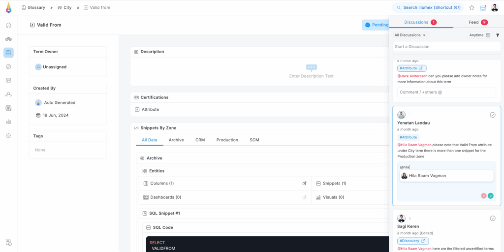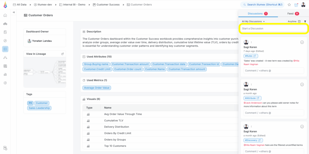 The discussion panel embodies illumex’s core mission of fostering collaboration between data practitioners and data consumers. It serves as a centralized hub where you can seamlessly initiate discussions with data owners and domain experts, bridging the gap and facilitating effective communication. Within Discussions, every illumex user has the power to ask questions, leave comments, and engage in meaningful conversations, all of which are readily accessible to every stakeholder involved.