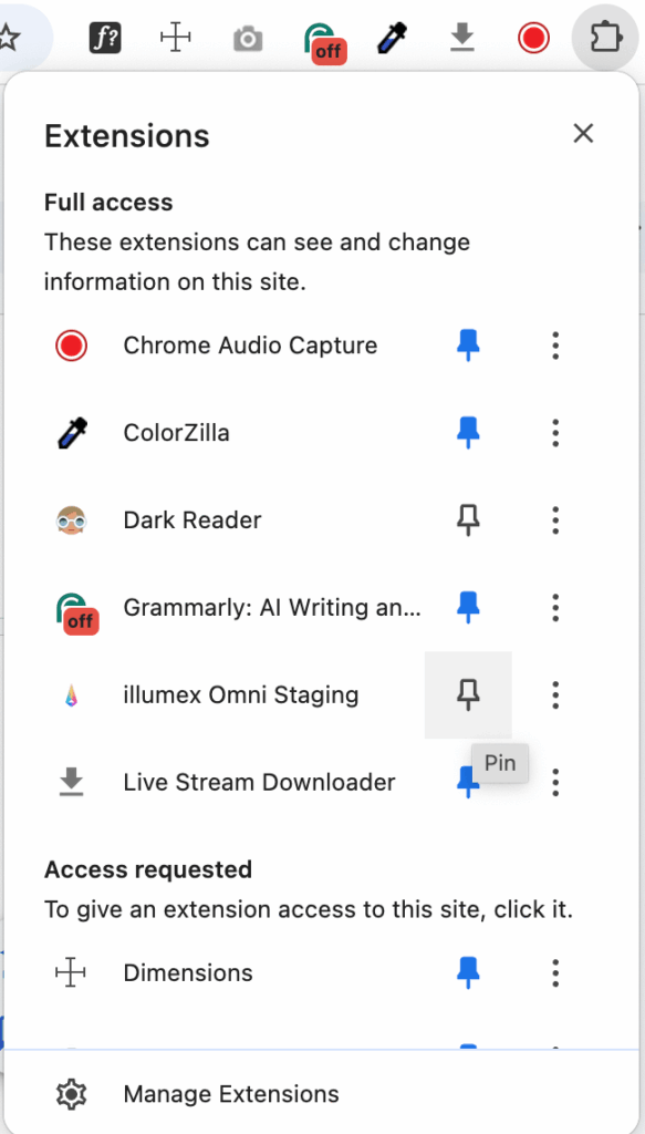 2. Pin the Extension – If the icon is not visible, click the Extensions dropdown (puzzle piece icon) and pin the extension.
