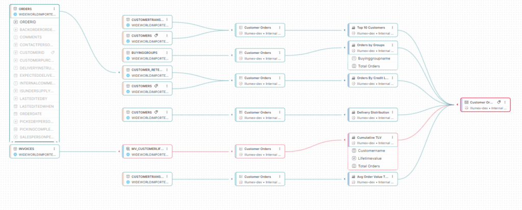 Visualize how data flows across your ecosystem — from source tables to calculated metrics in your BI dashboards.