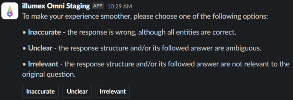 Each response from Omni can get reacted with 👍 (thumbs-up) and 👎 (thumbs-down) emojis. Use these to provide quick feedback: