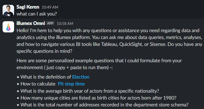 illumex Omni was created to streamline your organization’s interaction with Large Language Models (LLMs), like Llama2, or LLM Services, like GPT-4. Seamlessly integrated within your organizational chat workspace (like Slack), Omni enables real-time, reliable data querying with an enhanced contextual understanding and applied governance. Using a domain-specific engine that combines LLM and graphs, Omni interprets your prompts, matches them to your organization’s unique business data semantics, and auto-generates SQL queries. This ensures your questions are not only well-understood but are also directed to the appropriate data assets, effectively minimizing the risks associated with generative AI hallucinations and ambiguous outputs.