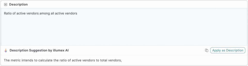 Regardless of how you maintain your metric store, illumex’s AI Assistant suggests the name and description to streamline the process further.
