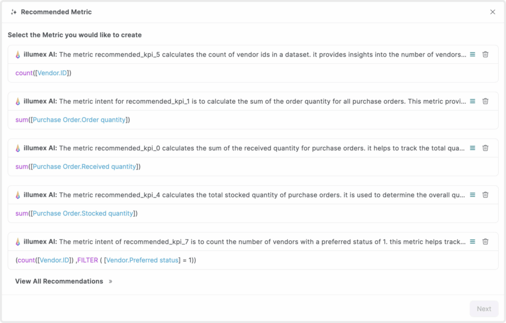 - Choose your metric from the list of auto-suggested metrics constructed by illumex based on your usage patterns and industry standards, with SQL query and formula over business terms included.