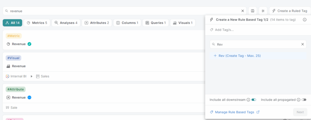 You can create a rule-based tag based on complex search criteria using the advanced search feature. For example, you can tag all tables and views that contain ‘prod’ in their name, have more than 100 columns, and lack documentation. This rule will apply to both existing and future objects meeting these criteria.