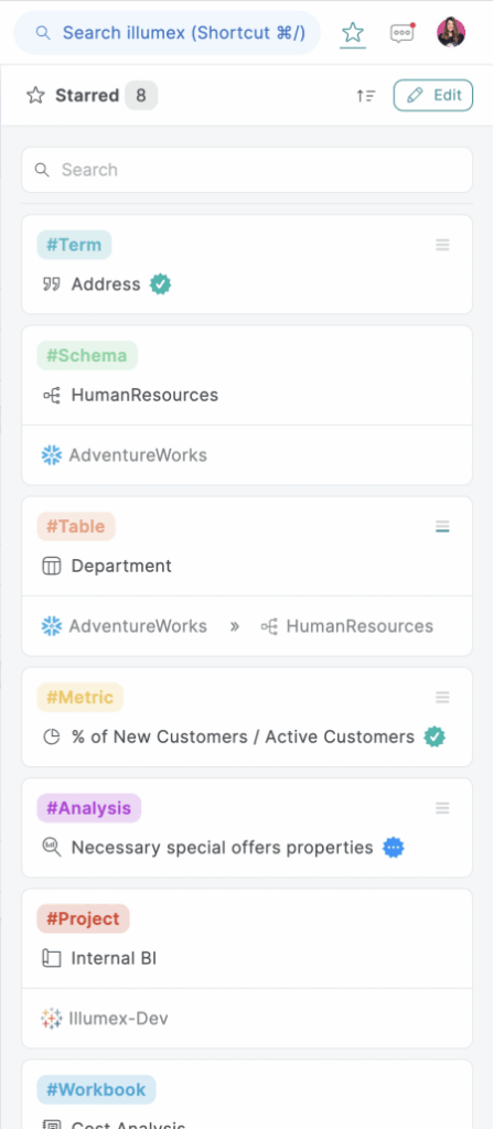 This panel provides you with a quick glance over the most important information about each starred entity, including its name, type, path, certification, and usage meter. This way, you can easily keep track of your most important entities without having to navigate through multiple pages or folders.