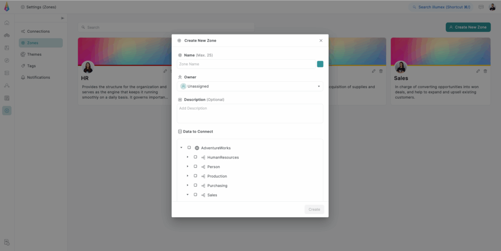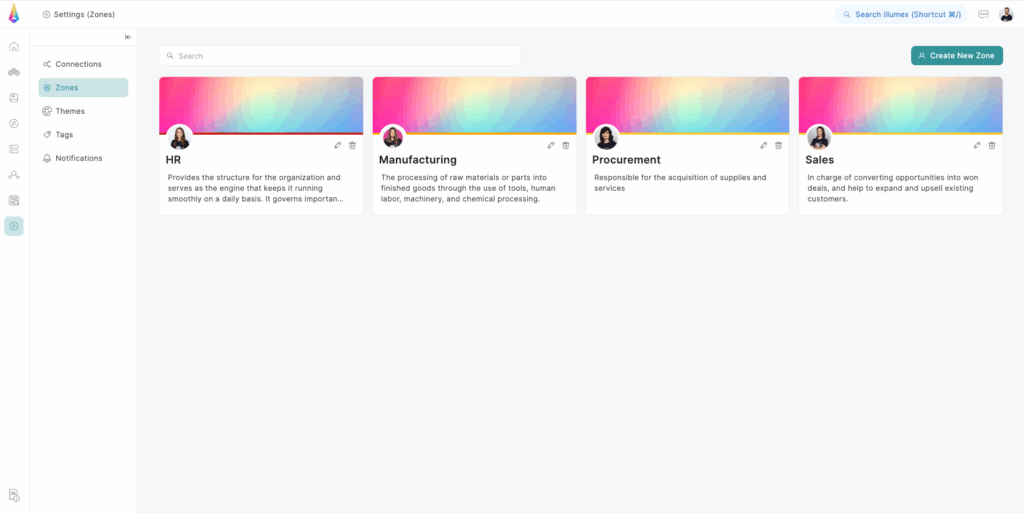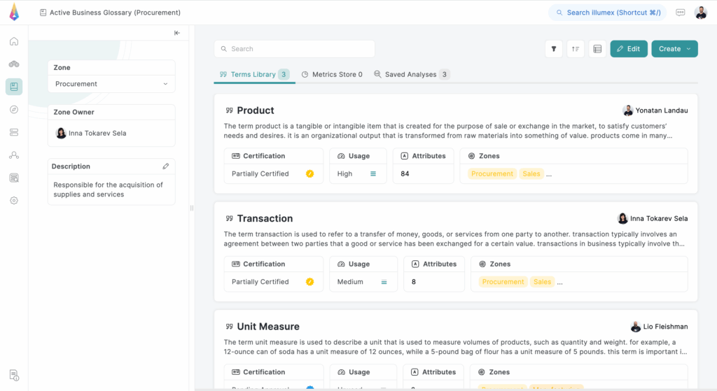 Zones serve as a dynamic tool to categorize your business glossary, enabling segmentation by product lines, business units, or sub-companies. This functionality allows for more organized access and management of glossary terms, facilitating a structured approach to handling business information.